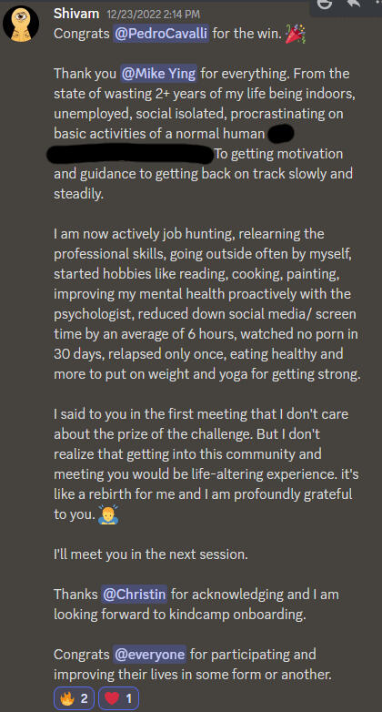 "From the state of wasting 2+ years of my life being indoors, unemployed, social isolated, procrastinating on basic activities of a normal human, To getting motivation and guidance to getting back on track slowly and steadily.I am now actively job hunting, relearning the professional skills, going outside often by myself, started hobbies like reading, cooking, painting, improving my mental health proactively with the psychologist, reduced down social media/ screen time by an average of 6 hours, watched no porn in 30 days, relapsed only once, eating healthy and more to put on weight and yoga for getting strong."– Shivam